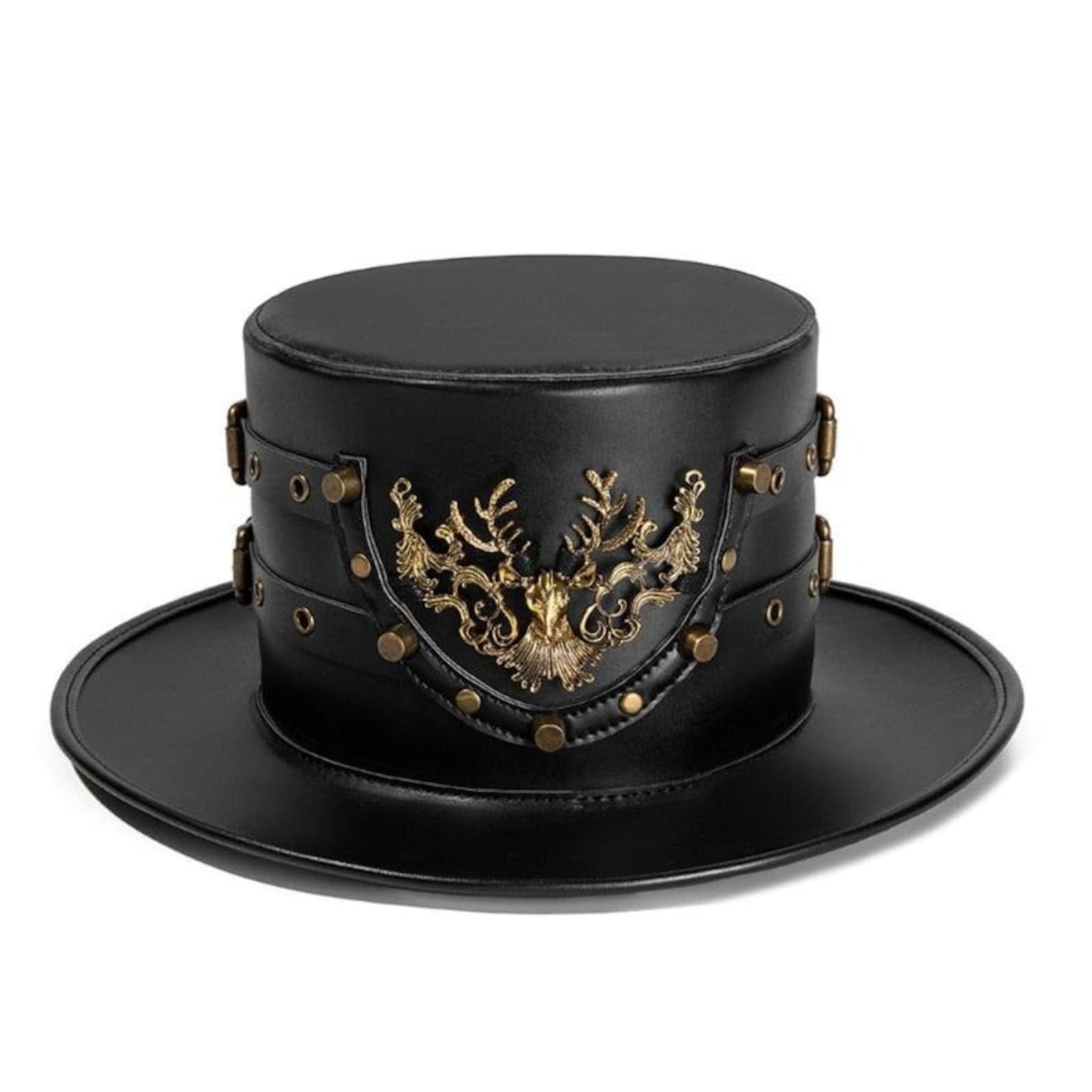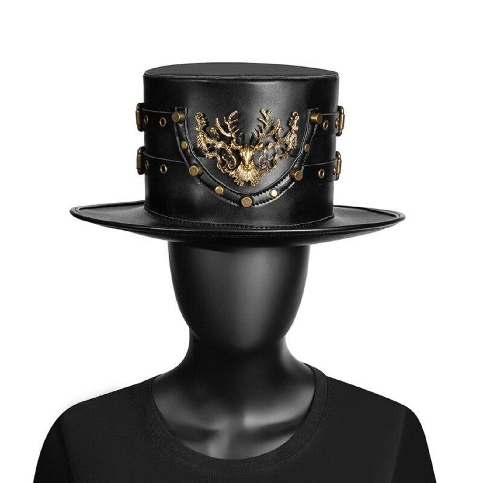 Black Leather Steampunk Top Hat – Stag Emblem | Viking Cosplay & Gothic Festival Wear