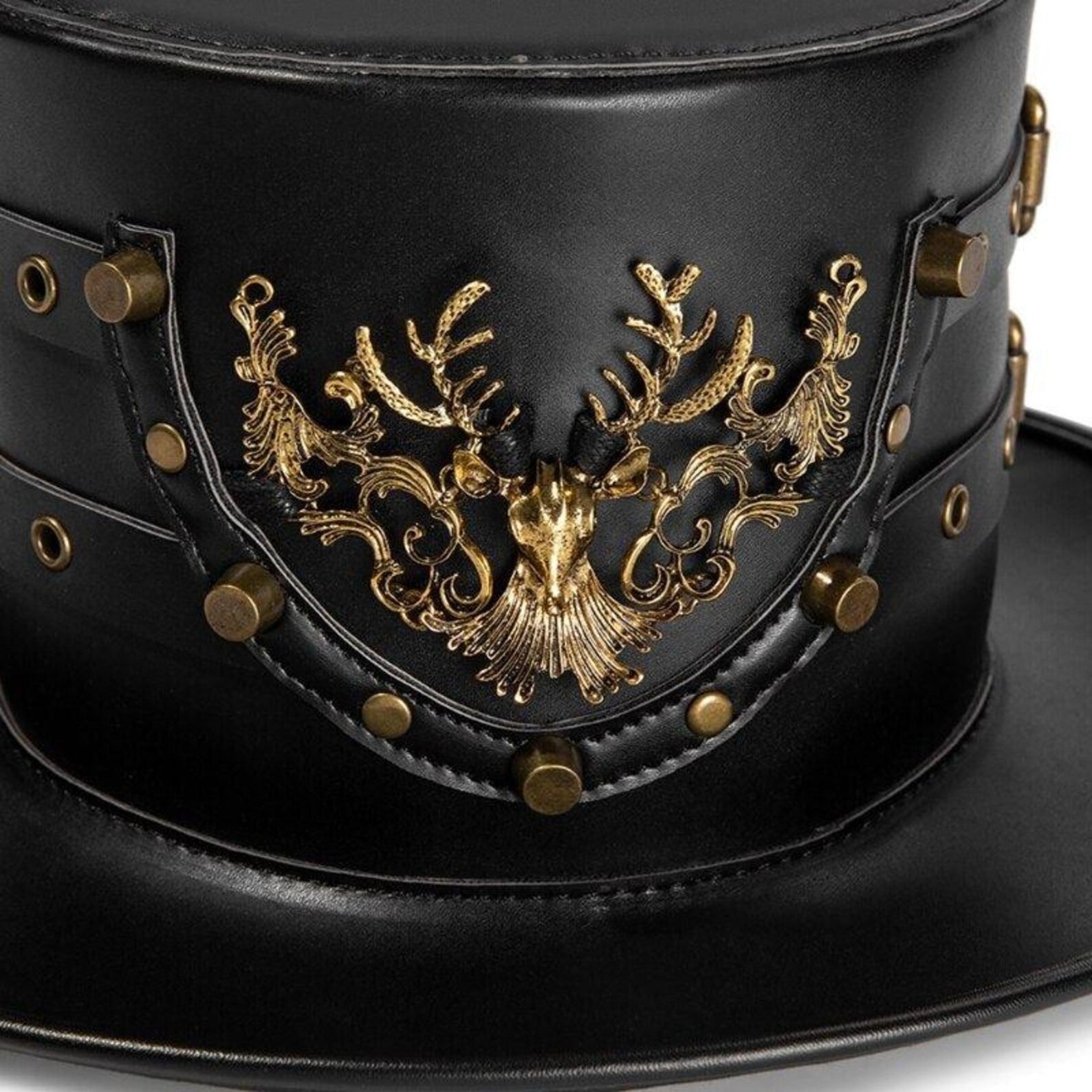 Black Leather Steampunk Top Hat: Stag Emblem, Viking Cosplay