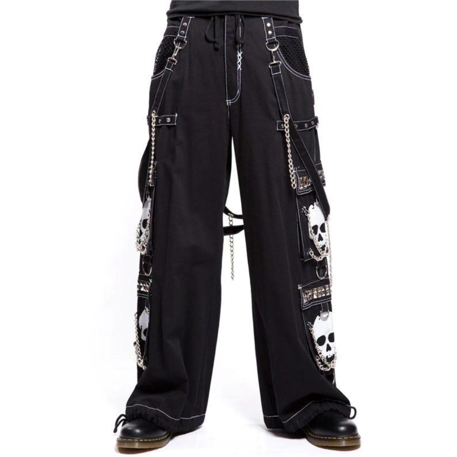 The skull motifs are either embroidered or printed with precision, ensuring each pair has its own unique character. 🎨 These designs draw from the rich history of subcultures like punk and goth, celebrating individuality and non-conformity. The chains are securely fastened with robust metal loops, adding a touch of defiance while staying durable for daily wear. The adjustable waistband, equipped with drawstrings and sturdy hardware, allows you to customize the fit to your liking, making these pants as comfortable as they are striking.