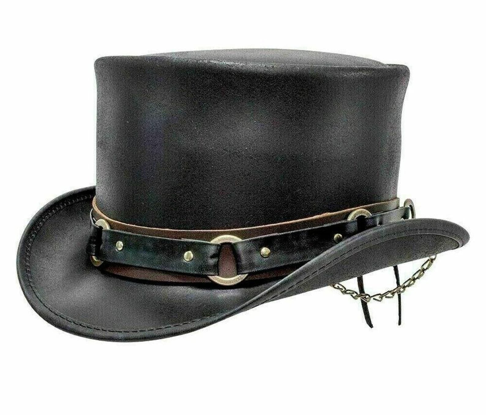 Unleash your dark Victorian flair with this handmade black leather steampunk top hat, featuring bold gothic chain details and brass ring accents. Crafted from premium genuine leather, it merges classic Victorian sophistication with rugged steampunk attitude — perfect for cosplay, festivals, or statement fashion.